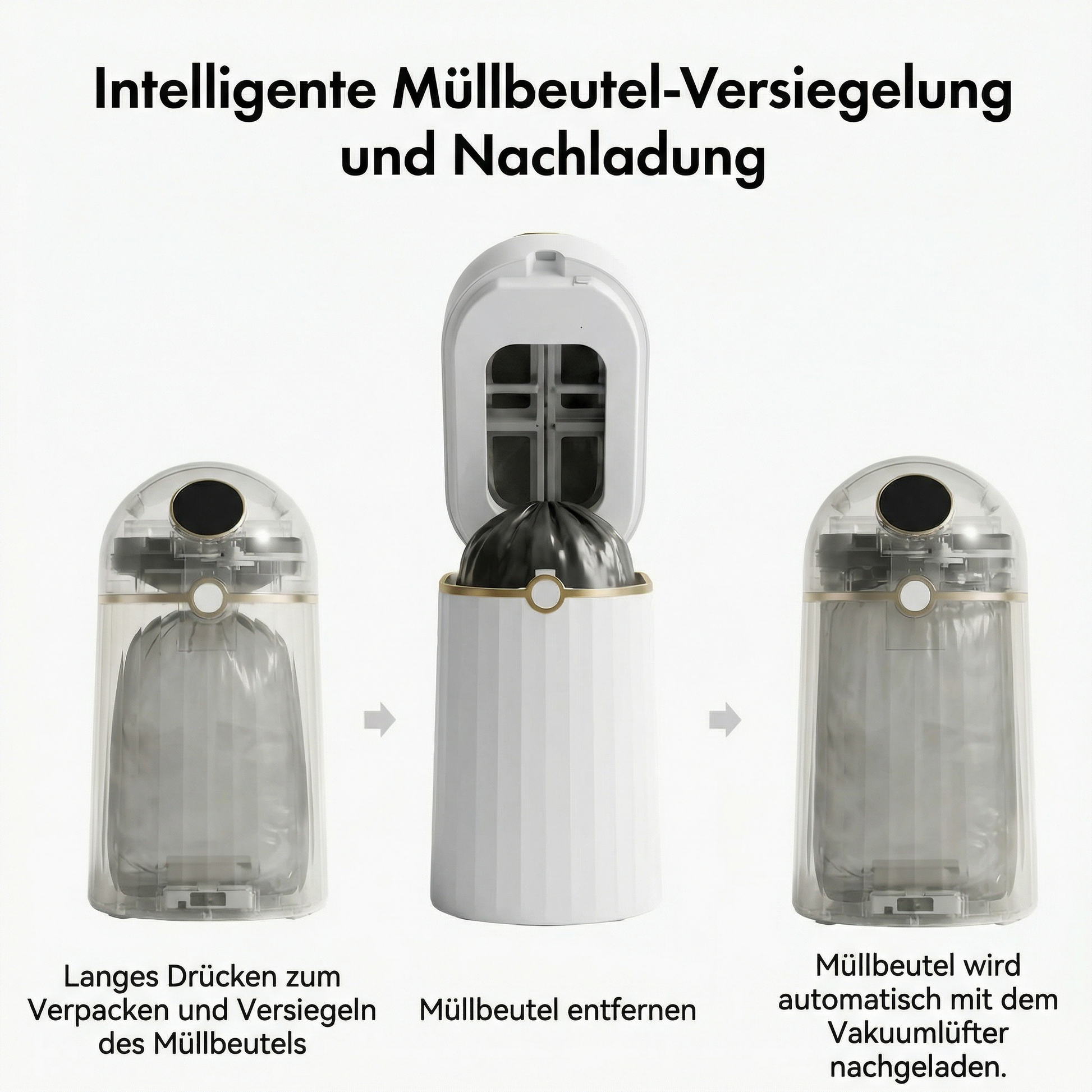 - Selbstwechselnd: Ein neuer Beutel wird automatisch eingesetzt und entfaltet.